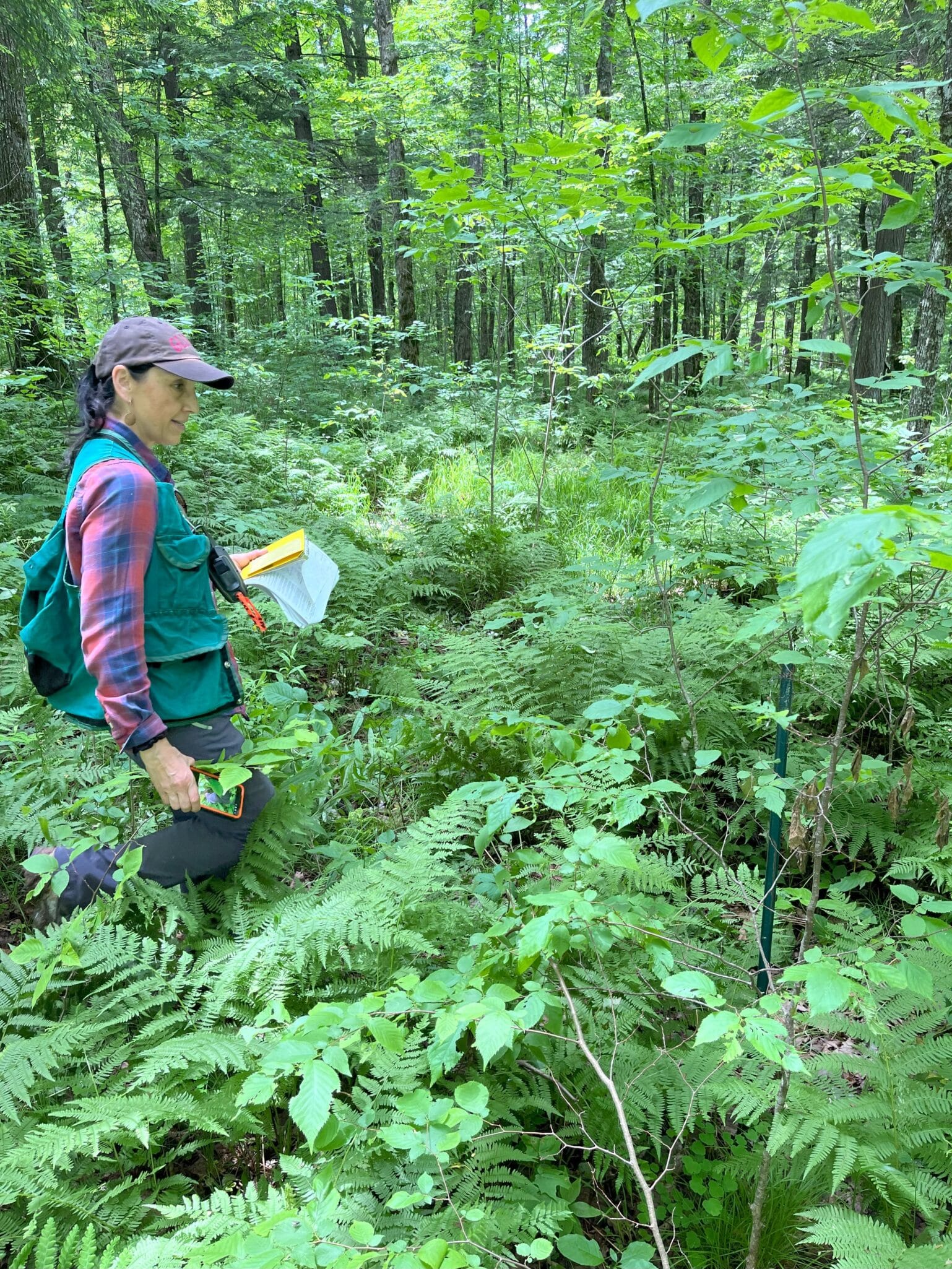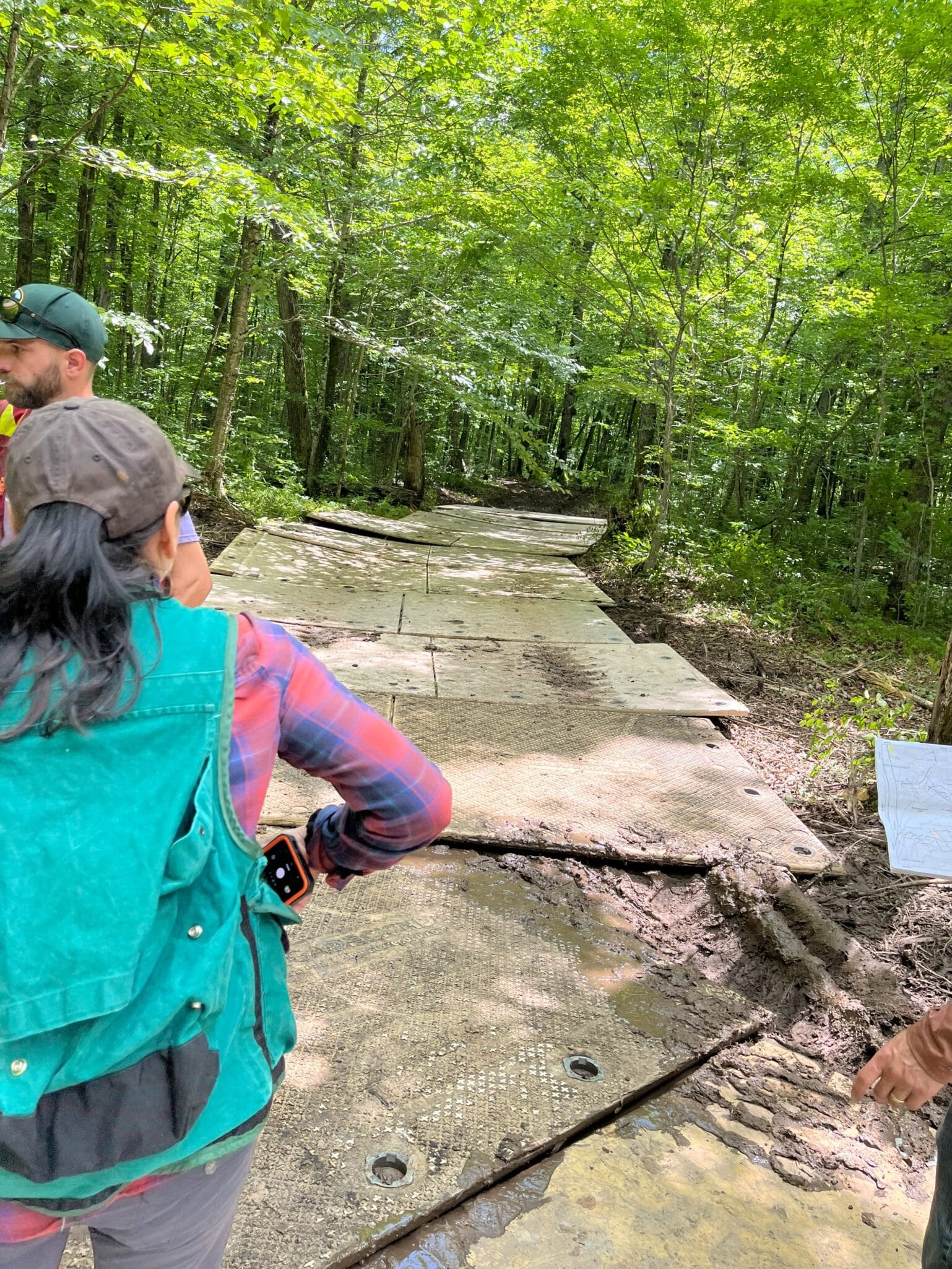 - GLIFWC staff tour Bend deposit drilling site in June 2025. Mats cover portions of the forest floor on path for drilling equipment. Photo courtesy of James Rasmussen, GLIFWC Policy Analyst.