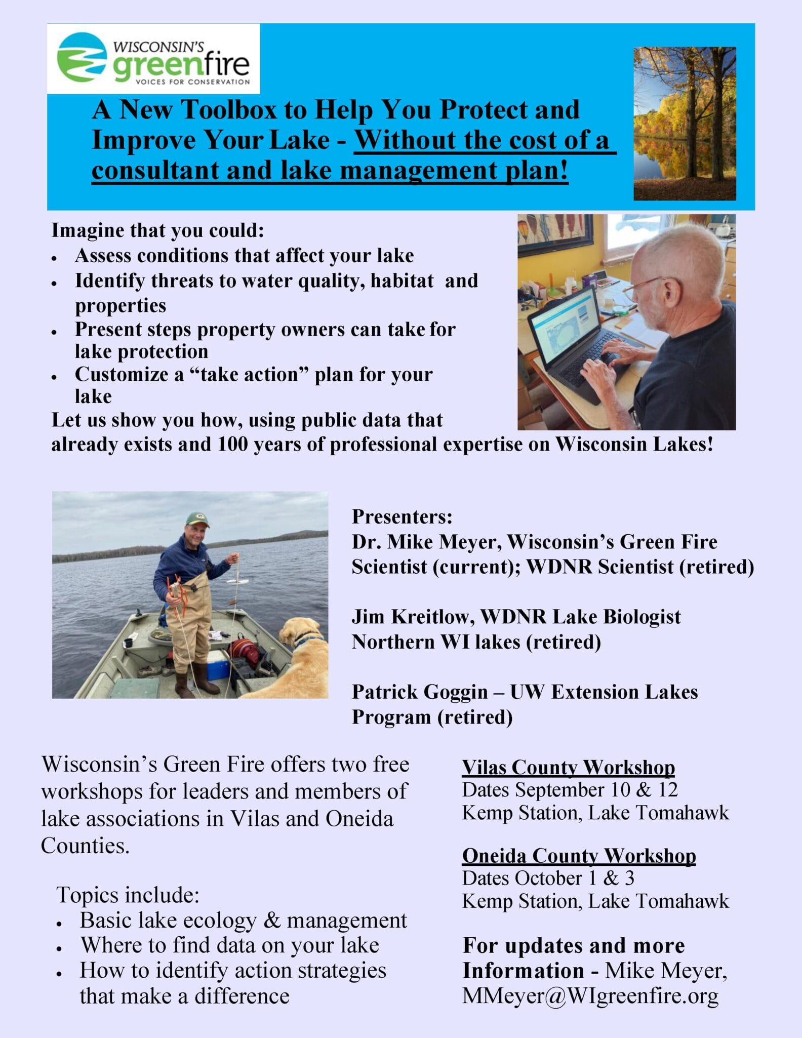 Wisconsin’s Green Fire is continuing to offer our Northern Lakes Toolbox Workshops for lake association leaders, members, and lakeshore property owners in fall 2025. These workshops will help participants protect and improve their lakes without the cost of a consultant and lake management plan!